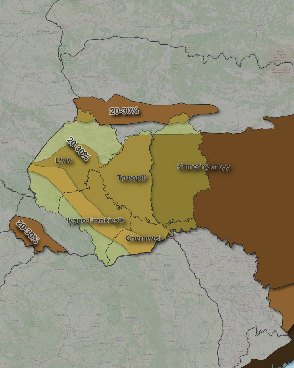 Figure 5: KSA Agricultural Operations in Western Ukraine: The layer shows five western oblasts; Lviv, Ternopil, Khmelnytskyi, Ivano-Frankivsk, and Chernivtsi, in which the Kingdom of Saudi Arabia owns farmlands as vast as 195,000 ha.