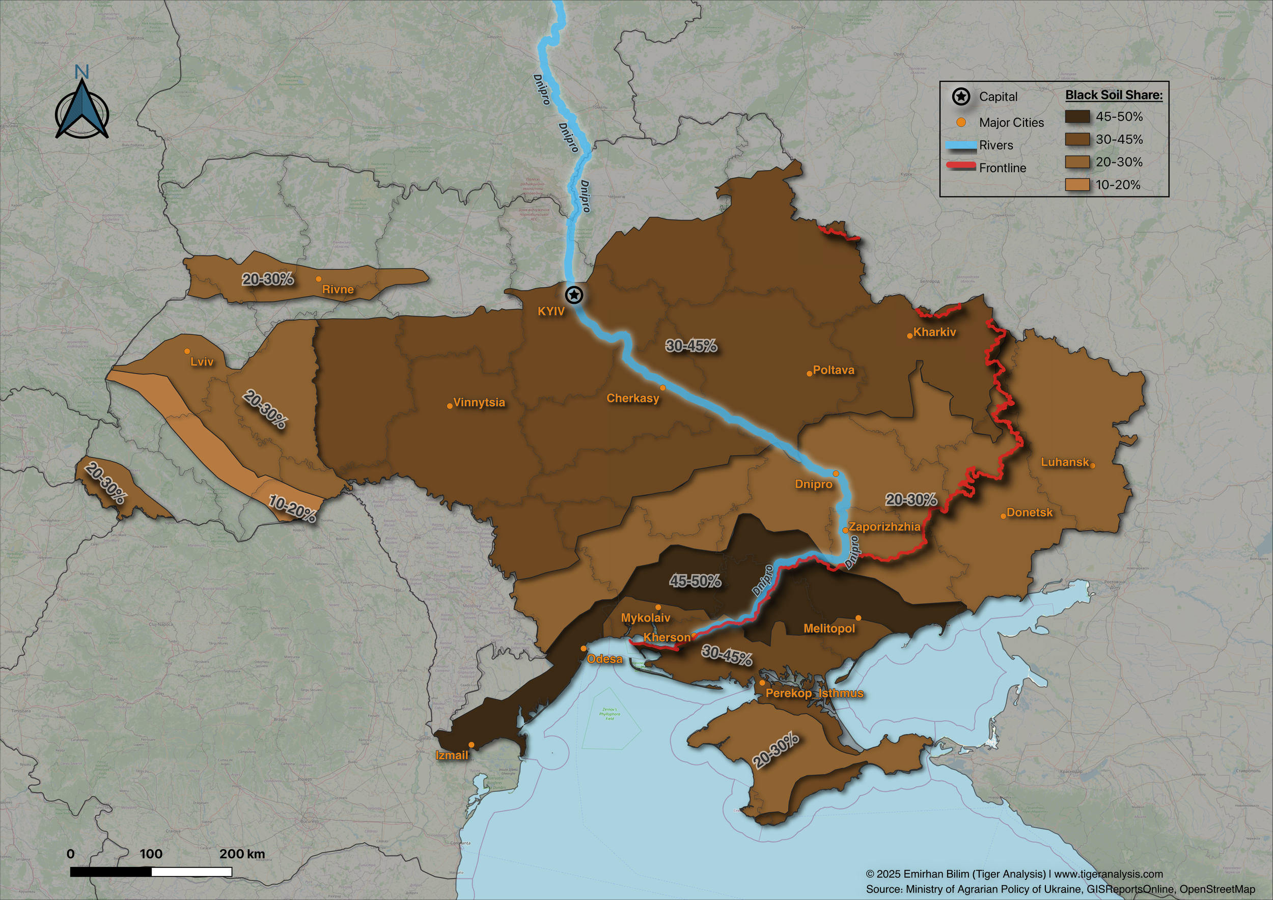 Figure 4: Ukraine’s Black Soil (Chernozem) Concentration Within Total Arable Lands: The map illustrates the approximate share of chernozem within Ukraine’s total arable farmland area.